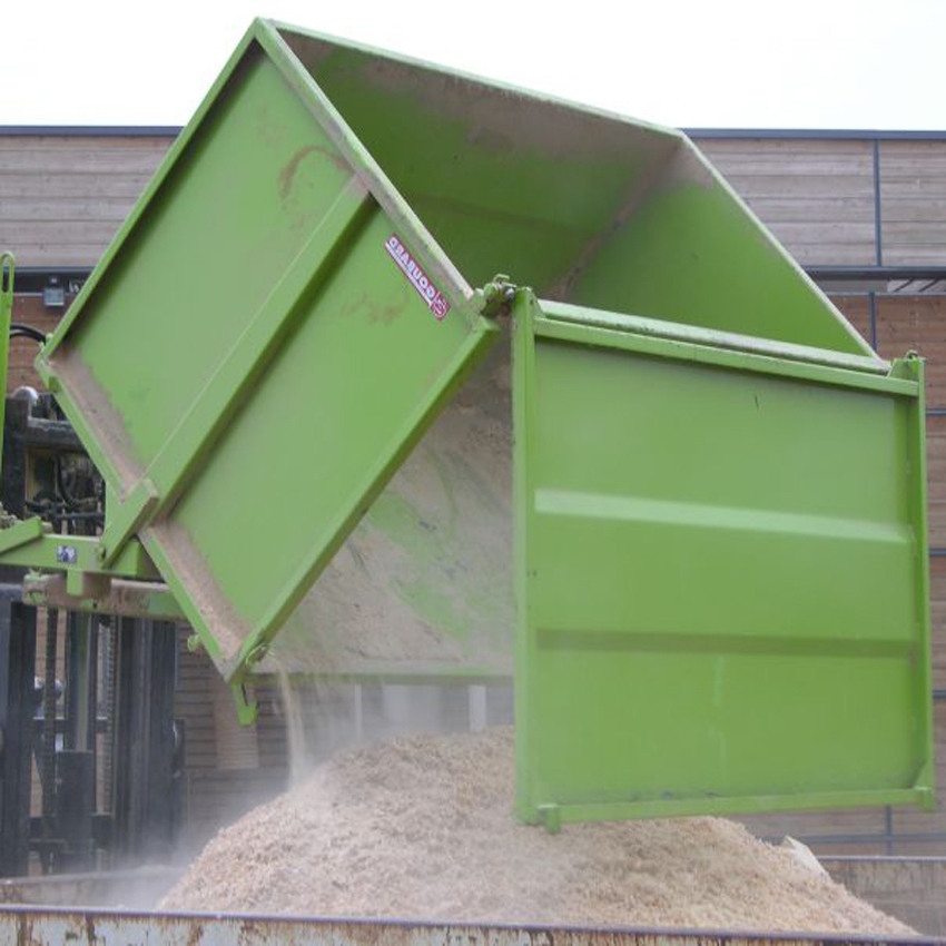 La benne basculante à porte frontale 1000 à 4800L est spécialement conçue pour contenir des chutes de bois, de la sciure, des sacs et est préconisée pour réception sous cyclone d'aspiration. Le basculement s'effectue à l'aide d'un levier manuel et la porte s'ouvre automatiquement lors du vidage.