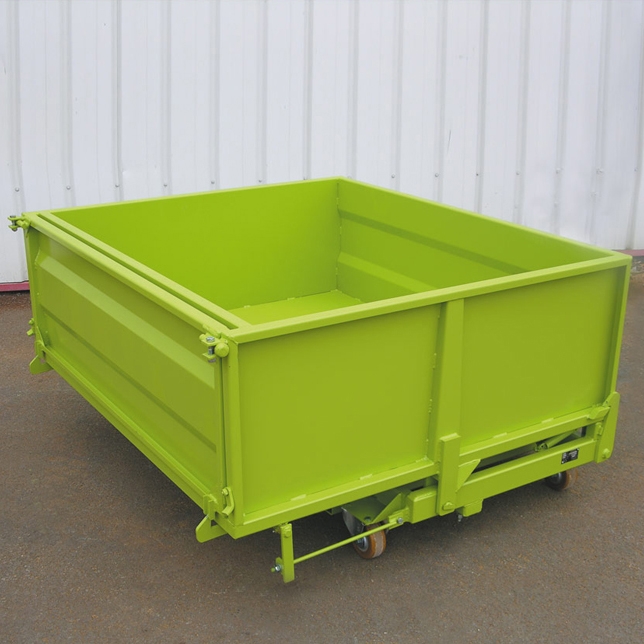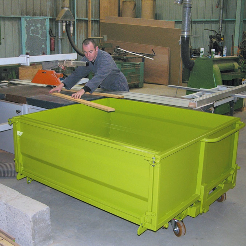 La benne basculante surbaissée à porte frontale 410 à 1300L possède une hauteur réduite spécialement adaptée aux tables de scie. Elle permet de récolter les chutes de bois, la sciure, le verre... Elle existe en version sur roues (2 fixes et 2 pivotantes) avec main courante ou sur socle avec prise transpalette.